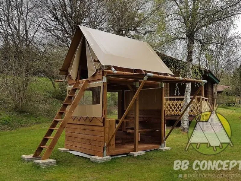 Cette cyclo cabane mi-bois / mi-toile sur plancher est équipée de l'électricité, d'une table, de bancs au rez-de-chaussée et d’un espace nuit pour deux personnes à l’étage, accessible par une échelle avec deux lits de 80x190 cm.Un bloc sanitaire est à proximité.