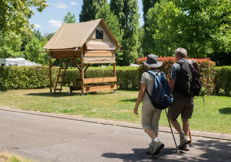 Three bivouac tents have been installed at the Gué Saint-Léonard campsite. This improved hut has a wooden structure and a strong canvas roof. This type of light accommodation (5 m²) sleeps 2 people. They are equipped with 2 single mattresses and 2 power sockets.A picnic table at the foot of the tent lets you enjoy the outdoors while being sheltered from the rain.