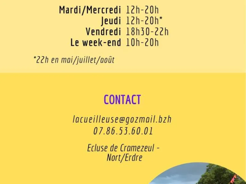 LA CUEILLEUSE - CAFE - FOURNIL - JARDIN - ECLUSE - BIVOUACAccueil VéloRestaurants Deze accommodatie is Accueil Vélo gecertificeerd en verbindt zich ertoe fietsers te ontvangen. Haar verplichtingen bekijkenBeschrijvingGeïnteresseerd in deze accommodatie? Bezoek hun website om te boeken of meer te weten te komen. Bellen E-mail Site webLocalisationEcluse de Cramezeul 44390 Nort-sur-ErdreKaartopties Standaard kaartachtergrond SatellietkaartLegenda Je débute J'ai l'habitude Aventure Itinéraires connexesGeïnteresseerd in deze accommodatie? Bezoek hun website om te boeken of meer te weten te komen. Bellen E-mail Site webAndere Accueil Vélo in de buurt GUINGUETTE DES JANETTESRestaurantsAccueil VéloSaffré LA CUEILLEUSE - CAFE - FOURNIL - JARDIN - ECLUSE - BIVOUACRestaurantsAccueil VéloNort-sur-Erdre GUINGUETTE 40 PIEDS ERDRERestaurantsAccueil VéloNort-sur-Erdre TERRASSE GOURMANDE ÉCLUSE LA TINDIÈRERestaurantsAccueil VéloNort-sur-ErdreHeeft u informatie om ons te melden over deze accommodatie? Een probleem signaleren Contacter