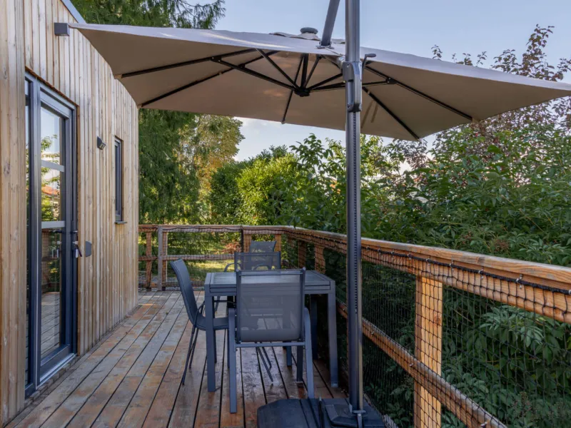 La terrasse de plain-pied, parfaitement intégrée à l'environnement naturel, devient un lieu privilégié de détente.
