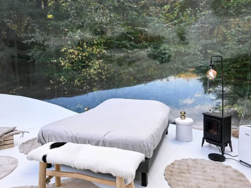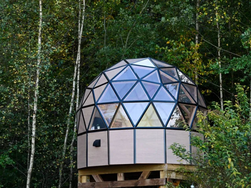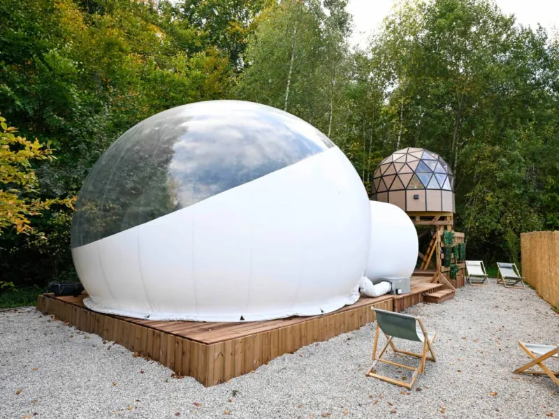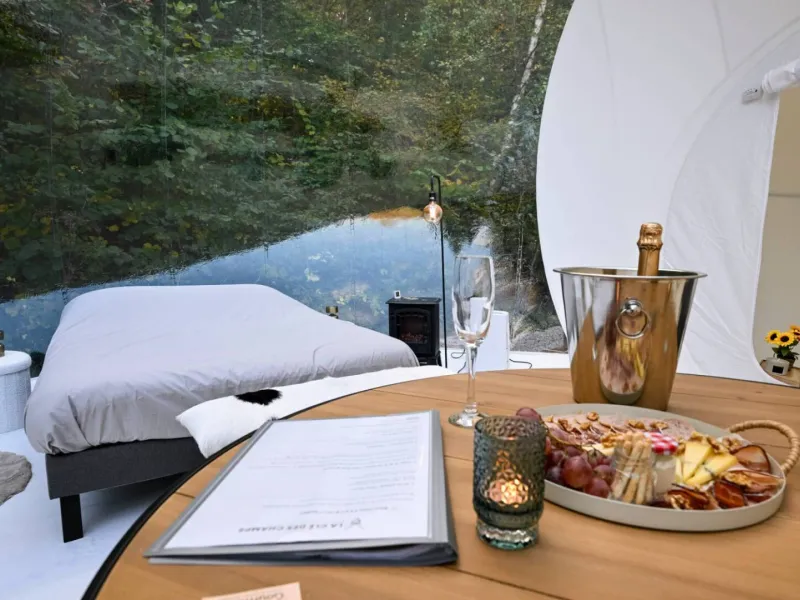 Succumb to the charm of the large Olia dome, an unusual and spacious accommodation designed for 2 to 4 people. A true bubble of serenity on two levels, its transparency plunges you into the heart of nature for a magical experience, between sky and greenery. Relax in your private Nordic bath, enjoy an exclusive terrace and let the surrounding calm lull you into an unforgettable stay.A sanitary chalet with shower and WC is just a few steps away. Breakfast, included in the price, will get your day off to a good start.