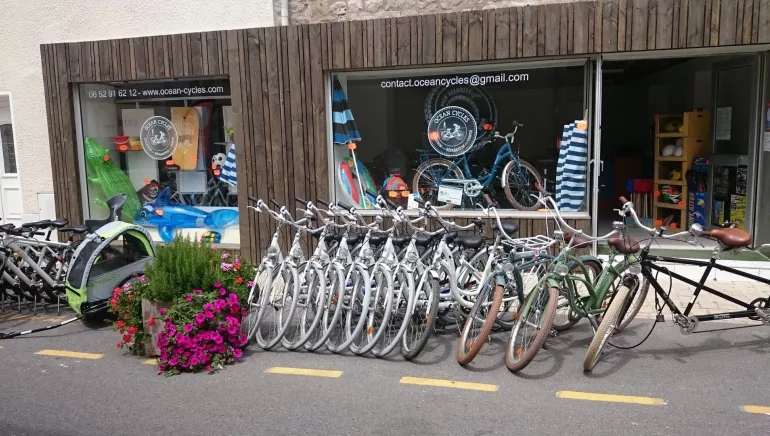 OCEAN CYCLES offers a range of cycle-related services such as bike hire (mountain bikes, children's bikes, electrically-assisted bikes, etc.), the sale of bicycles with an emphasis on French brands, the sale of accessories, the repair and maintenance of bicycles of all makes, as well as home delivery and collection services for repairs in the workshop.